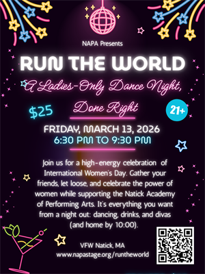 Join us for a high-energy celebration of International Women’s Day. Gather your friends, let loose, and celebrate the the power of women while supporting the Natick Academy of Performing Arts. It’s everything you want from a night out: dancing, drinks, and divas (and home by 10:00).